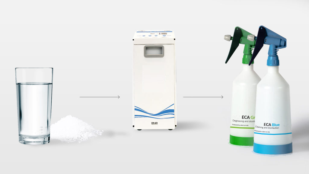 Im Vergleich zur herkömmlichen Reinigung mit Produkten, die giftige Chemikalien enthalten, ist das TERRANOW ECA System umweltfreundlich. ECA ist eine Abkürzung für elektrochemisch aktiviert. Es ist ein Prozess, bei dem Wasser und Salz